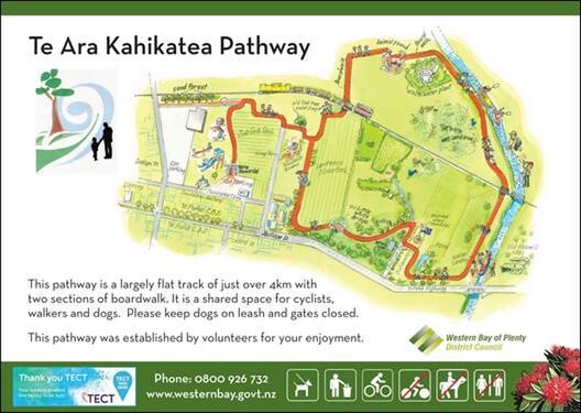 The Te Ara kahikatea pathway leads through the Te Puke Cemetery, winds down the Waiāri Stream past the wastewater treatment plant and back across to Lawrence Oliver park.