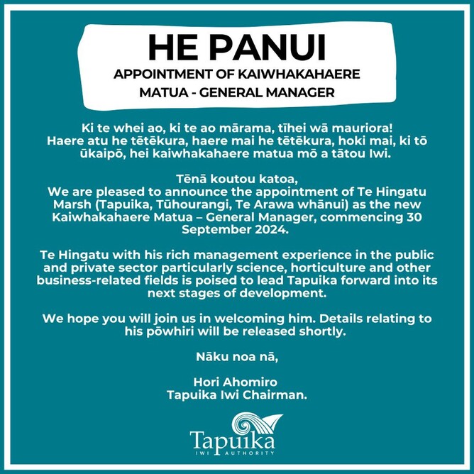 We are pleased to announce the appointment of Te Hingatu Marsh (Tapuika, Tūhourangi, Te Arawa whānui) as the new Kaiwhakahaere Matua – General Manager, commencing 30 September 2024.