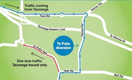 While the lane closure is in place, traffic heading towards Te Puke from Tauranga/Papamoa will be diverted along the Tara Road, Parton Road, Bell Road route. VMS boards will be displayed advising of the upcoming diversion dates.